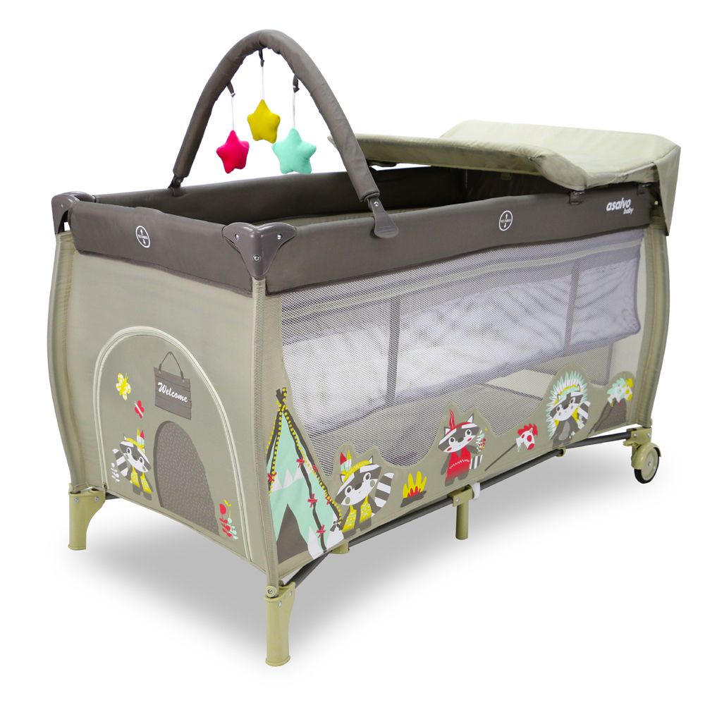 Vi har fundet Weekendseng Inkl Puslebord Vaskebjørn fra Asalvo hos eurotoys i kategorien . Asalvo Complet med sød vaskebjørn og indianer tema i grågrønne nuancer. Komfortabel weekendseng med aftageligt puslebord, legemobil og lynlåsåbning, der muliggør, at barnet selv kan kravle ud af sengen. Den har to hjul med bremser, og bunden kan inds